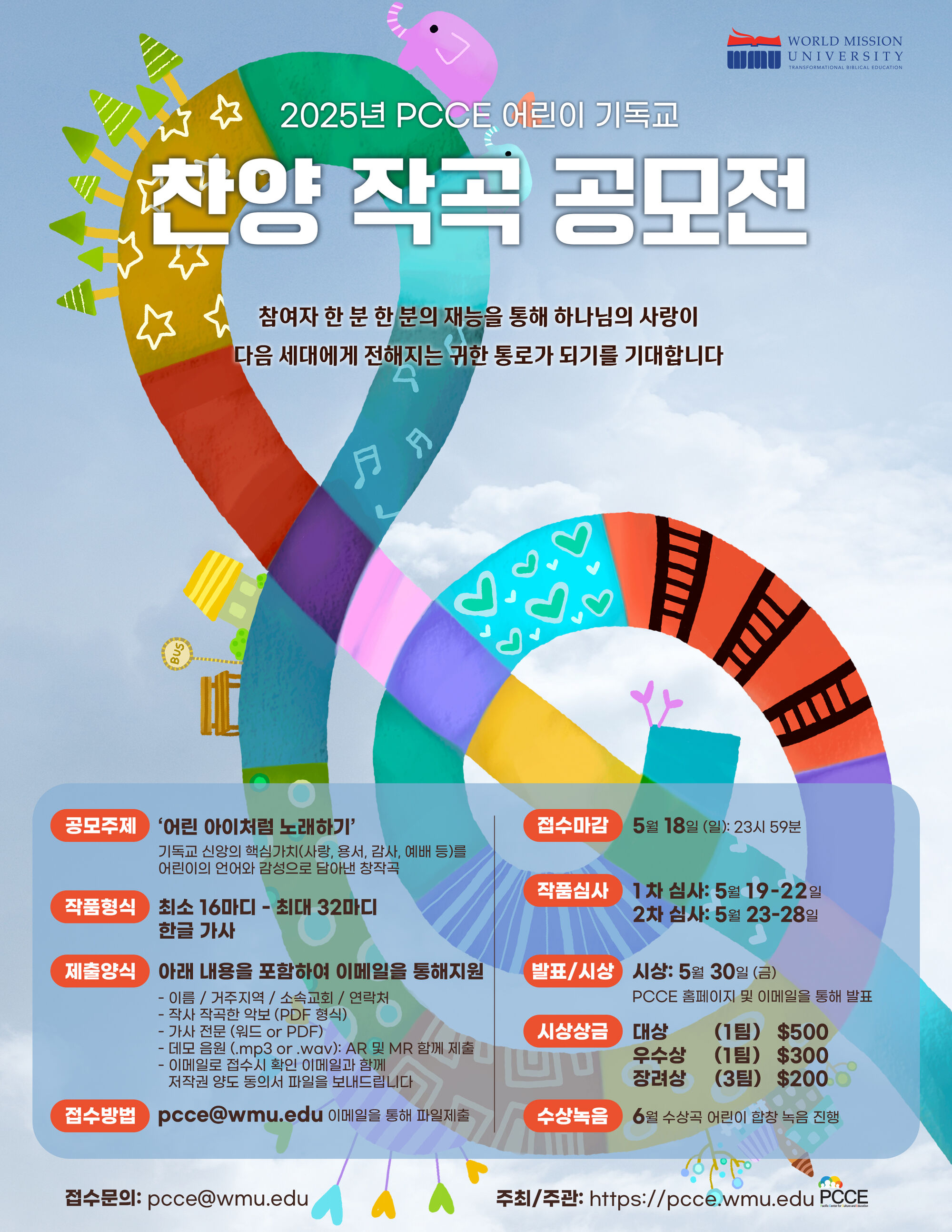* 공모주제 : '어린 아이처럼 노래하기' 기독교 신앙의 핵심가치를 어린이의 언어와 감성으로 담아낸 창작곡 * 작품형식 : 최소 16마디 - 최대 32마디, 한글 가사 * 제출양식 : 포스터 내용 참고 * 접수방법 : [email protected] 이메일을 통한 파일 제출 * 접수마감 : 5월 18일(일) 23시 59분 * 작품심사 : (1차 심사) 5월 19~22일, (2차 심사) 5월 23~28일 * 발표/시상 : 5월 30일(금), PCCE 홈페이지 및 이메일을 통해 발표 * 시상상금 : 대상 1팀 $500, 우수상 1팀 $300, 장려상 3팀 $200 * 수상녹음 : 6월에 수상곡 어린이 합창 녹음 진행