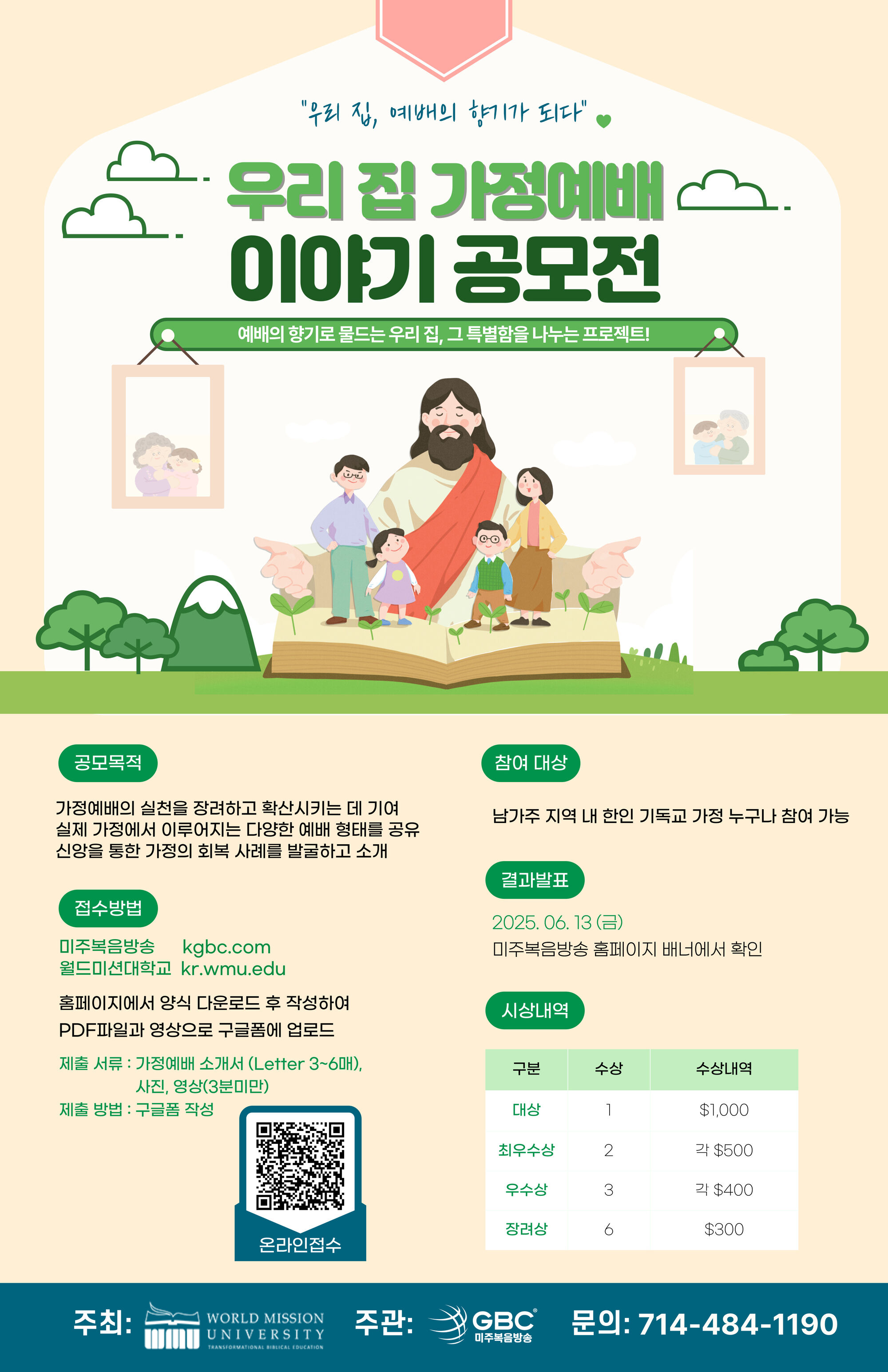 * 공모목적 가정예배의 실천을 장려하고 확신시키는 데 기여하고 실제 가정에서 이루어지는 다양한 예배 형태를 공유하며 신앙을 통한 가정의 회복 사례를 발굴하고 소개하기 위해 * 접수방법 미주복음방송 kgbc.com 월드미션대학교 kr.wmu.edu 홈페이지에서 양식을 다운로드 후 작성하여 PDF파일과 영상으로 구글폼에 업로드 - 제출 서류 : 가정예배 소개서 (Letter 3~6매), 사진, 영상(3분 미만) - 제출 방법 : 구글폼 작성 * 참여 대상 남가주 지역 내 한인 기독교 가정 누구나 참여 가능 * 결과발표 2025년 6월 13일(금). 미주복음방송 홈페이지 배너에서 확인 * 시상내역 대상 1가정 $1,000, 최우수상 2가정 각 $500, 우수상 3가정 각 $400, 장려상 6가정 $300